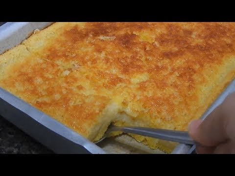Bolo de fubá e queijo ralado foram feitos um para o outro! A massa é incrível e se divide em camadas, ou melhor, fica uma base de massa de bolo, no meio uma camada super cremosa que parece um pudim e em cima outra camada de bolo. É de dar água na boca!