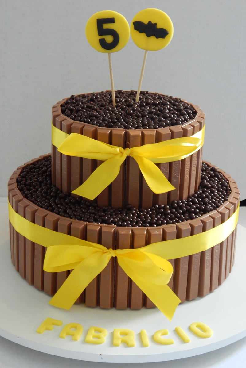 Imagem 43 – Bolo de dois andares com bolinhas de chocolate e KitKat nas bordas. Aqui, somente a plaquinha e a cor amarela identificam o tema Batman.
